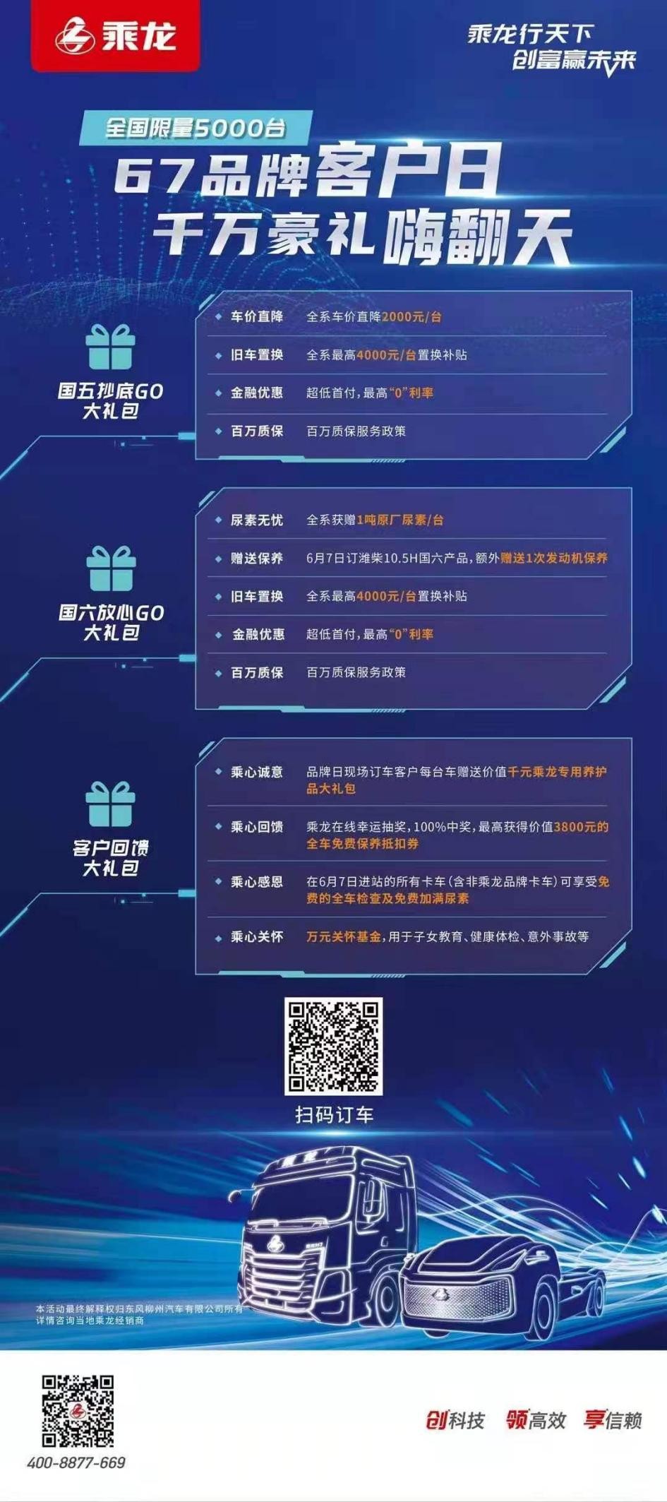 品牌日期间用户购买国六全系产品,每台均可获赠 1 吨原厂尿素;旧车置换全系最高可享受4000元/台置换补贴;同时也和国五车一样,享受超低首付、最高“0”利率的金融优惠,价值千元乘龙专用养护品大礼包,以及百万质保服务政策和乘龙国六CK专用机油钜惠抢购福利!