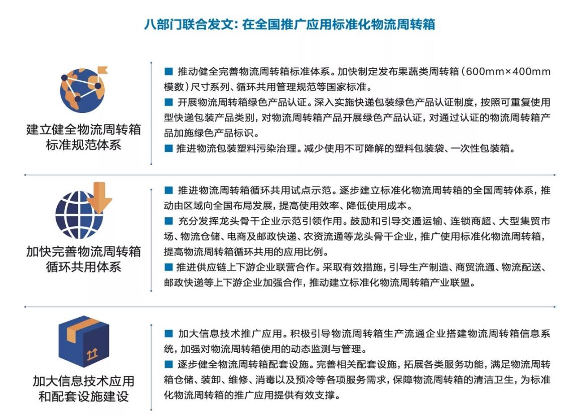 早前,交通运输部、国家发展改革委、工业和信息化部、农业农村部、商务部等八部门联合发布《关于做好标准化物流周转箱推广应用有关工作的通知》(简称《通知》),提出加快推进物流包装绿色转型,着力构建现代物流体系,为服务构建新发展格局提供有力支撑,将在全国推广应用标准化物流周转箱。