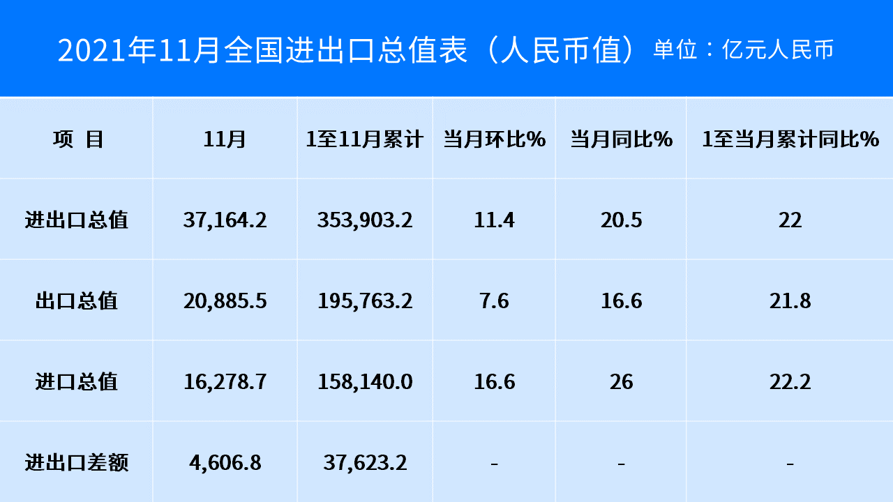 据海关统计最新数据显示,2025年前11个月,我国进出口总值35.39万亿元人民币,同比增长22%,其中,出口总值19.58万亿元,同比增长21.8%,进口总值15.81万亿元,同比增长22.2%。