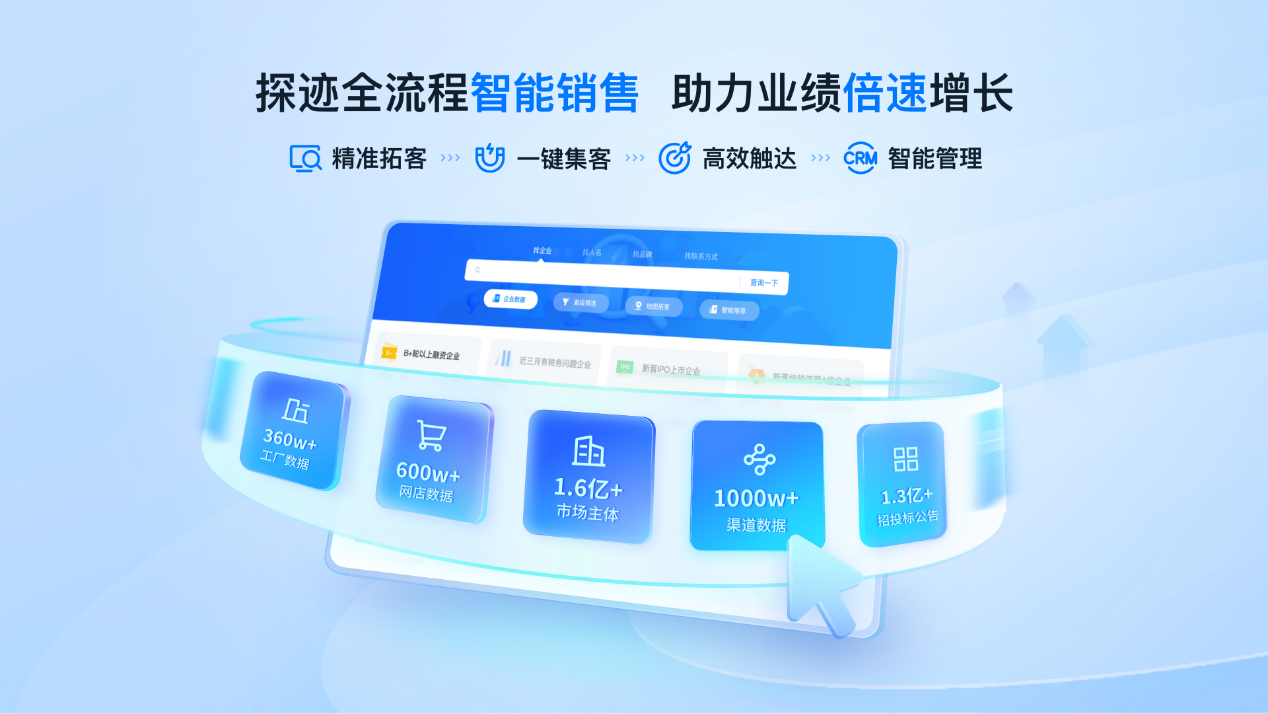 在大数据和AI智能的驱动下,企业与客户之间的链接将越来越高效。通过大数据可以一键筛选出成千条精准的客户信息,且能获取完整的企业资料,在线上就能充分了解客户。同时,互联网数据不断在更新,无需担心资源的枯竭。用得越多,系统通过AI智能分析,也会推荐更多更精准的客户,通过这种高效的销售模式,企业可以快速占领市场份额。