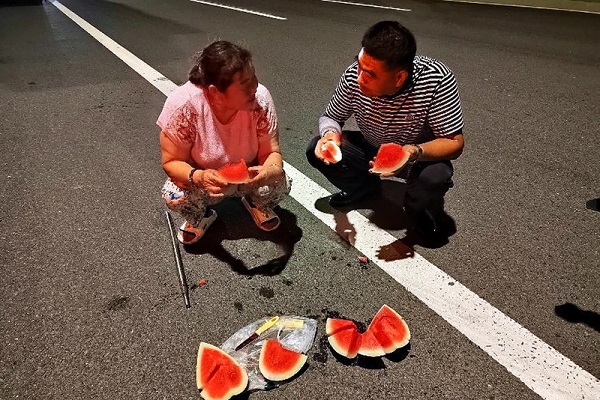 经过3个多小时的行驶,次日凌晨2点多,车辆来到了安徽池州。“休息一会吧!等快天亮的时候我们在上路。”熄火后,王书安夫妇二人邀请随行的记者吃西瓜解暑。期间,夫妻俩说说笑笑,恩爱有加。