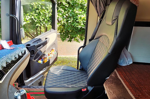 “是四点悬浮式的驾驶室,经过坑洼路面时没有颠簸感,避震效果特别好。座椅也是气囊减震的座椅,可调节,对司机的颈椎和腰椎能起到很好的保护,长时间驾驶,不会觉得特别疲劳。”