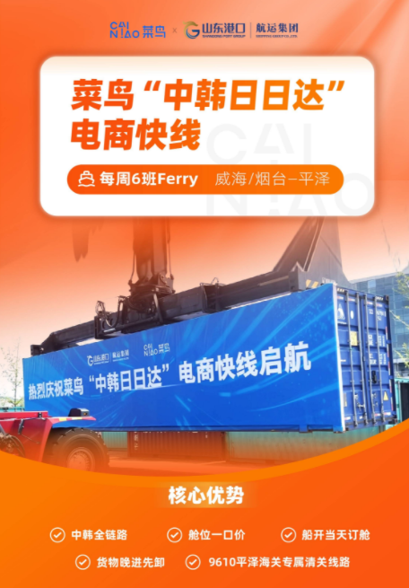 7月18日,菜鸟与山东港口航运集团宣布共同开通“中韩日日达”电商海运快线,每周运营6班客货船(F
