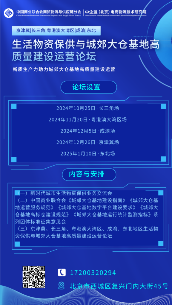 构建高效、安全、可持续的城市生活必需品流通保供体系,既是相关政府部门的重大课题,也是社会各界的责任与使命。为贯彻国家积极稳步推进超大特大城市“平急两用”公共基础设施建设,确保紧急条件下城市生活物资保供保畅,加快建设现代商贸流通体系。经中国商业联合会商贸物流与供应链分会、中企盟(北京)电商物流技术研究院研究决定,拟分别在长三角、粤港澳大湾区、成渝、京津冀以及东北地区召开生活物资保供与城郊大仓基地高质量建设运营论坛。论坛以“新质生产力助力城郊大仓基地高质量建设运营”为主题,旨在建设高效顺畅的现代商贸流通体系,助力我国生活物资保障体系建设,实现流通经济的创新与繁荣。